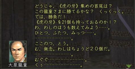 | | だから、その数を一本でも上回れば、彼との勝負は自動的に勝ち、と言うことになります。 早速必要分だけ取り出して、見せに行きましょう。 クエストを達成してしまうと、見せ合った虎の牙は消滅します。 面倒でも、必要分だけもって行きましょう。