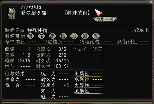 | | そういうわけで手に入るのが、この「愛の招き猫」です。 例によって、こんなものは入魂ですぐ作れるご時勢になりましたが、やっぱり、そういうほのぼの系クエストも忘れてはいけませんね。